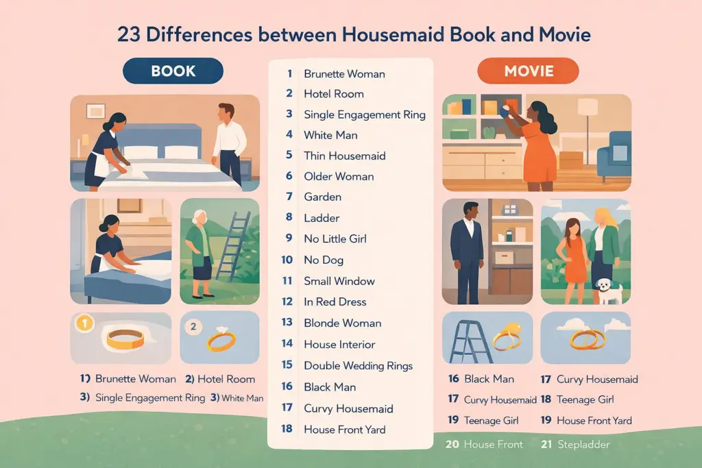 Discover 23 key differences between Housemaid book and movie. See how the novel and film contrast in plot, characters, and suspense.